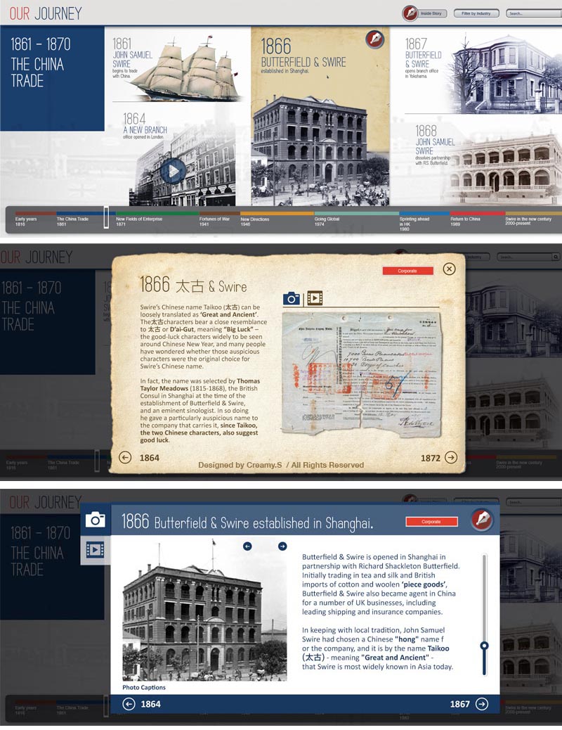 The timeline design shows the heritage and development of John Swire and Sons (HK) Ltd. over the past two centuries. Designed by Creamy.S, All rights reserved